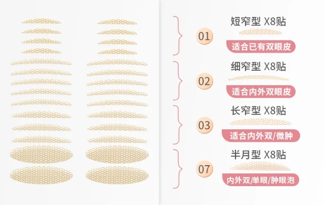 1.寬形雙眼皮貼:適合眼皮脂肪較厚的內(nèi)雙或單眼皮,它的支撐性較強(qiáng)。